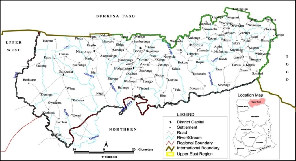 FONAR currently implements projects in the semi-arid Upper East Region (UER) of Ghana. The Region is lies predominantly in the Sudan Savanna agro-ecological zone of Northeastern Ghana and administratively divided into 15 District Assemblies (Local Government Authority Areas). The Region covers an estimated land area of 8,842 km2, of which 80% suffers from moderate to severe land degradation. The Sudan Savanna climatic zone has distinct dry and wet (unimodal rainfall) seasons with peak rainfall in September. Annual rainfall ranges between 600 and 1200 mm, and virtually all the rains are received within 4-5 months. The UER had a total population of 1.3 million people in 2021, with an annual growth rate of 2.0 percent1. The average population density of the region is 147.2 people/km2, as compared to the national average population density of 139.5 people/km2.